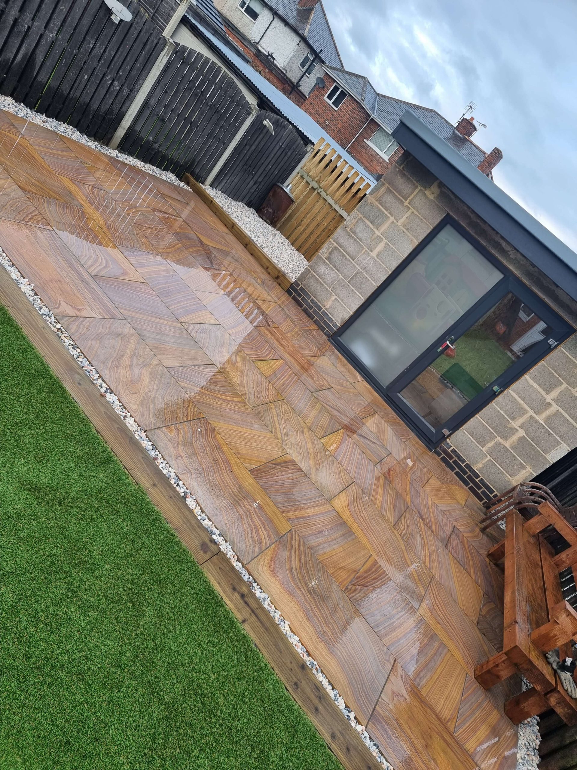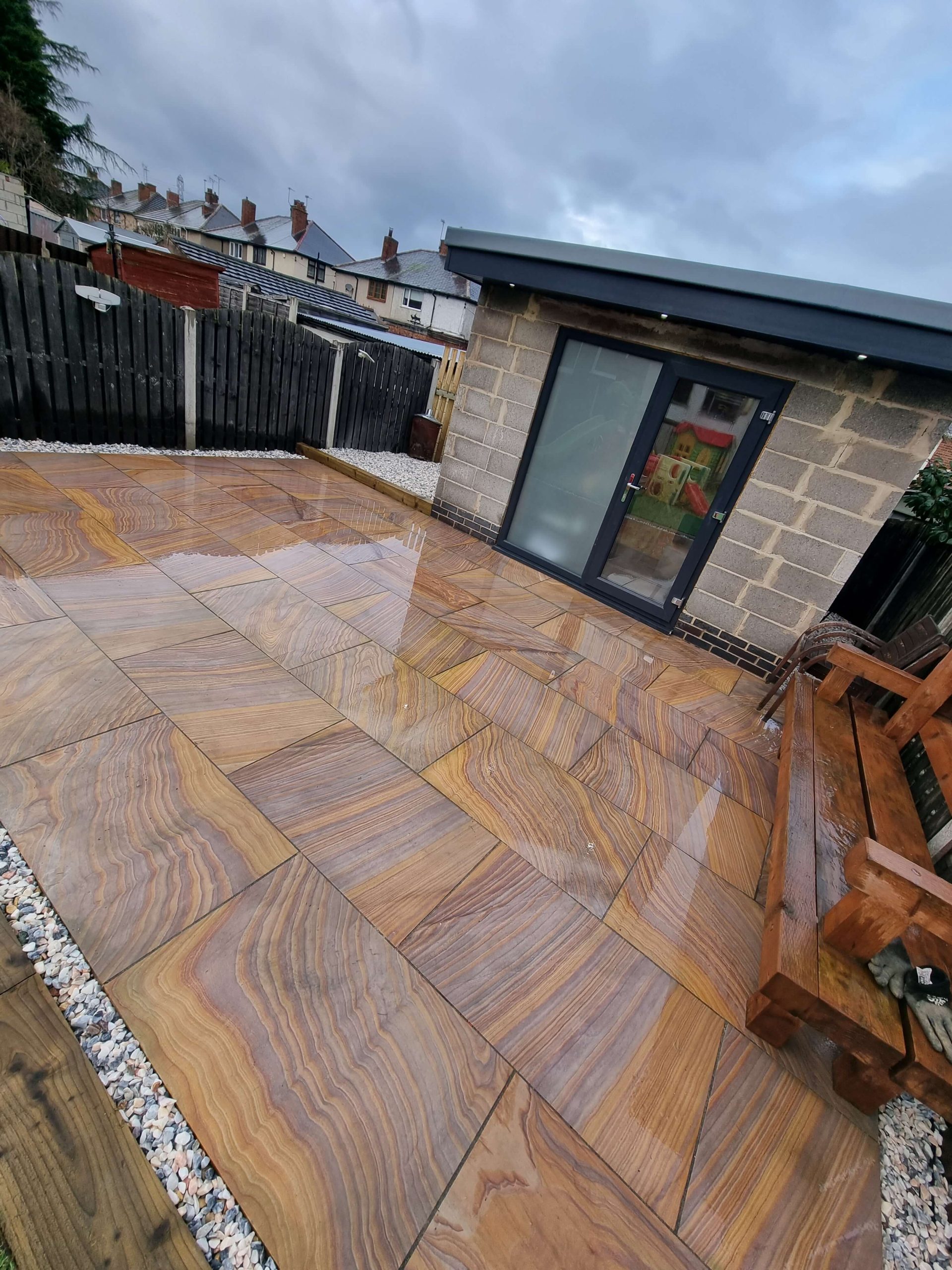 The Paving: We installed a large-format natural sandstone patio. The stone was specifically chosen for its rich, earthy wood-grain patterns, which tied in perfectly with the wooden sleepers and the company name.