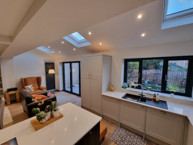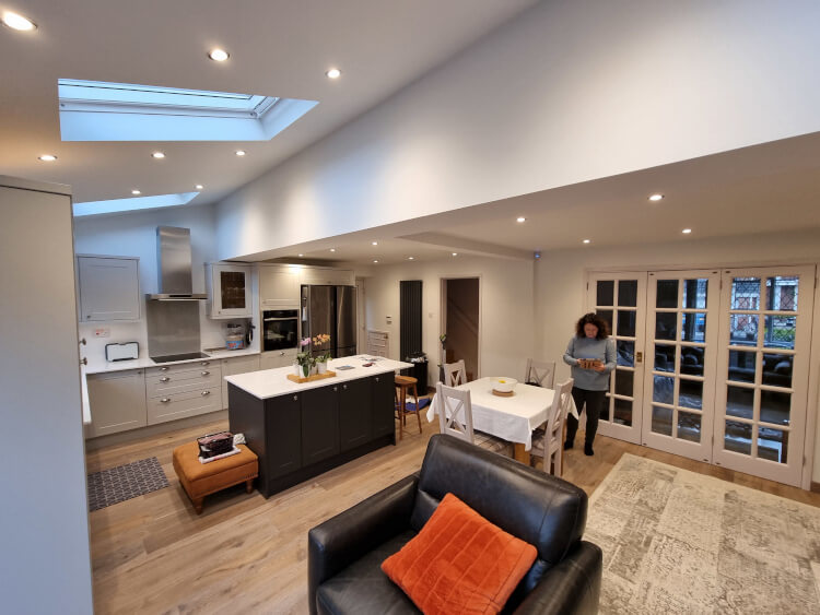 She had opted for a single storey extension with a new kitchen and a dining area from our partner Yorkshire Kitchens Co. Alongside this she wanted a aluminium bifold door and skylight to open the space up.
